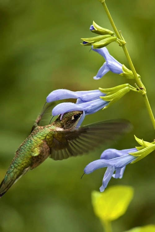 If you are looking for flowering plants that are absolutely sure to draw hummingbirds, Argentine Skies Salvia, also commonly known as Hummingbird Sage or Blue Anise Sage, is a “must-have” plant for your garden! A hardy perennial in USDA Zones 7a-10b, it can be grown in garden beds or containers. In zones north of 7a, you can grow it as an annual or in containers that can be overwintered indoors. Â