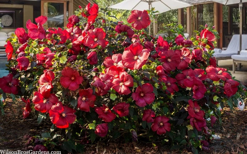Growing 3 to 4 feet tall and equally as wide, the Head Over Heels ‘Desire’ Hibiscus makes a bold and beautiful specimen in the landscape or in large containers. Especially impressive in groupings of three or as a colorful hedge. Because it blooms all summer and into fall, and has such bold foliage, it makes a nice backdrop or centerpiece in flower gardens. Also excellent around pools, ponds and other bodies of water. A fine addition to butterfly and hummingbird gardens, red theme gardens, rain gardens and tropical look gardens.