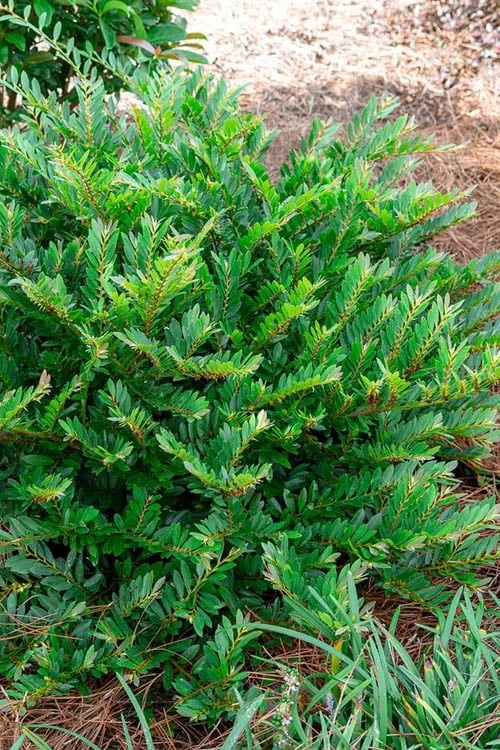 Growing in a rounded form that reaches 2 to 3 feet tall and 3 to 4 feet wide, Jewel Box Distylium is ideal for use as an accent, in groupings, or as a staggered or straight row hedge planting in home foundation plantings and landscape borders. It is also very useful in mass plantings to dress up embankments, hillsides and slopes and where its roots do an excellent job stabilizing soil for erosion control.